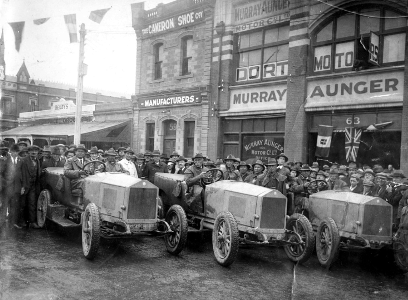 Murray Aunger in King William Street, Adelaide and his team aboard three Dort cars prior to departing for Darwin in July 1922…