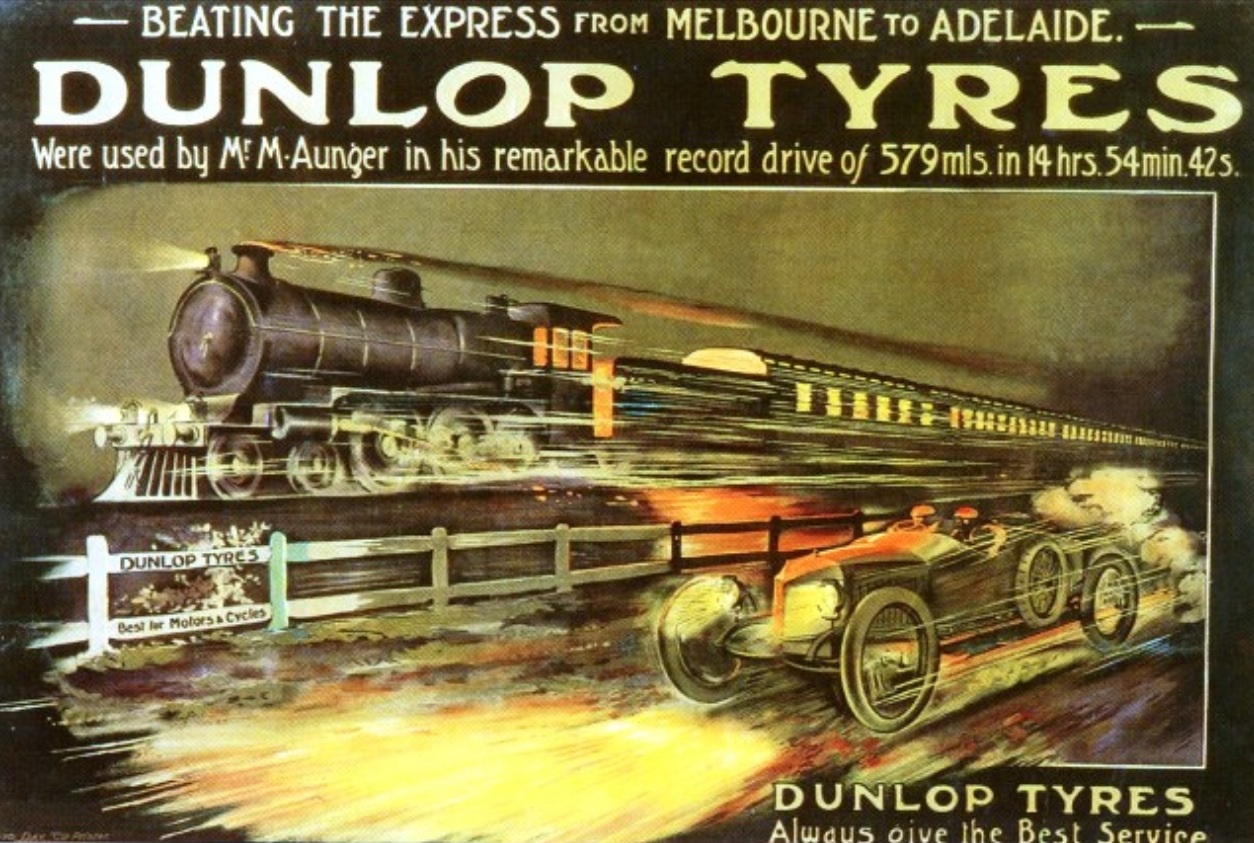 Dunlop ad celebrating the Aunger/Bearsley Vauxhall Prince Henry Melbourne-Adelaide record breaking run in 1914.