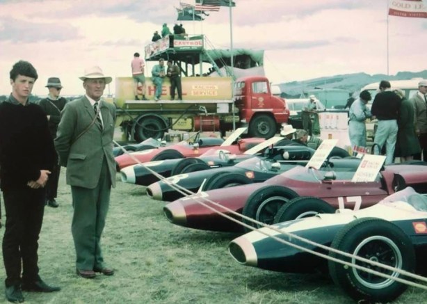 Wigram Shell Team compound, from this end; Bruce Abernathy Cooper T66 Climax, John Riley Lotus 18/21 Climax, Andy Buchanan #8 Brabham BT6 Ford 1.5 twin-cam, perhaps the Scuderia Veloce Graham Hill Brabham BT11A Climax and uncertain closest to the truck (A McKee)Those early years of the F1 tyre war rolled as follows; Dunlop shod Clark’s 1965 winning Lotus 33 Climax and Stewart’s 1969 winning Matra MS80 Ford. Goodyear bagged back to back titles in 1966 and 1967 on Jack’s Brabham BT19 Repco and Denny’s Brabham BT24 Repco, while Firestones were on the Lotus 49 Ford Cosworth DFV used by Graham Hill in 1968, and Jochen Rindt’s Lotus 72 Ford in 1970.