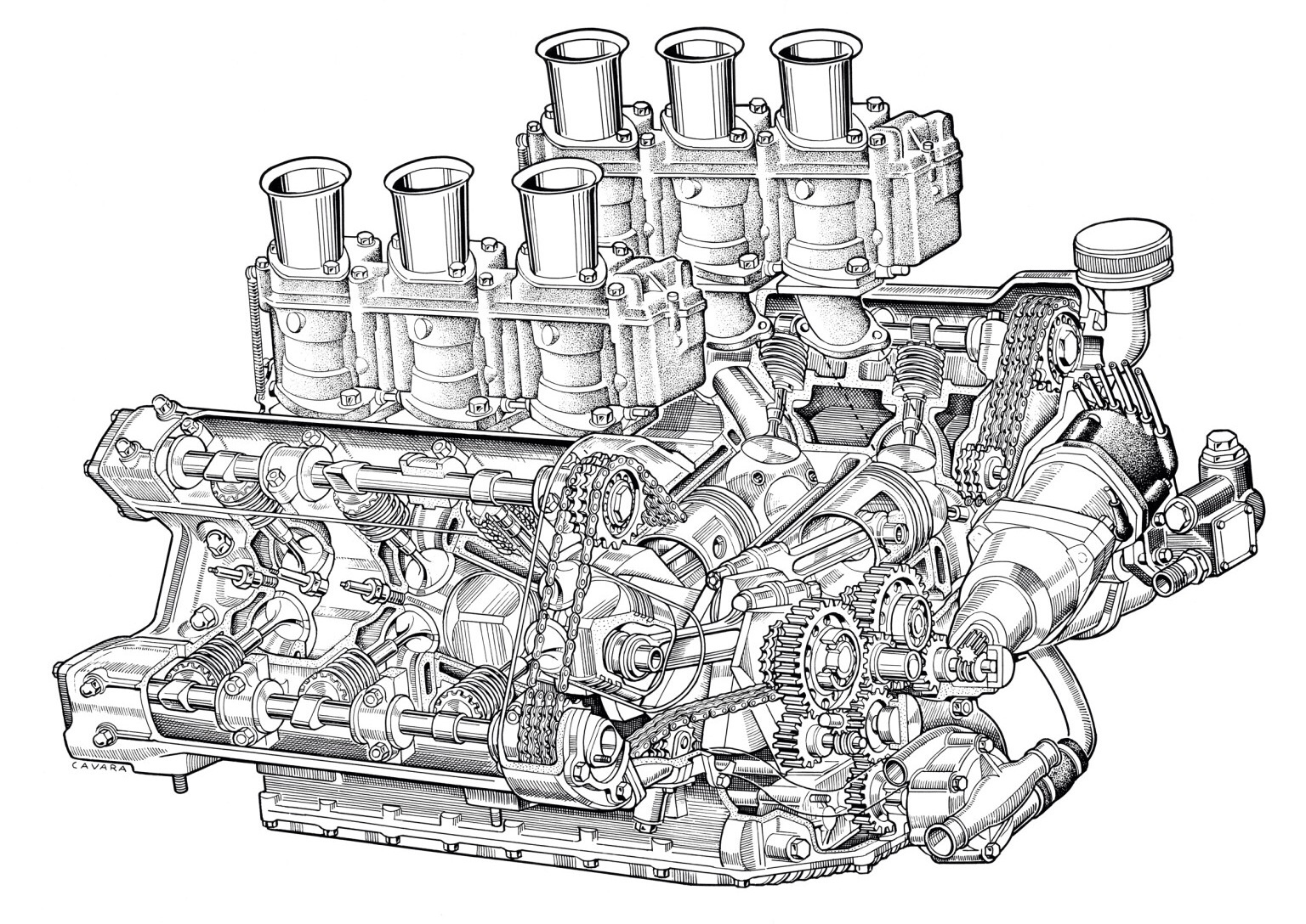Itala 12-cylinder fwd, 1926. Tested but never raced, these innovative cars would have competed against such classics as the 1.5-litre Delages. They were true single-seaters with fully independent suspension; the supercharged V12 engines were built in 1500cc and 1100cc form, the single central camshaft flanked by its two rows of horizontal valves. Drawing appeared in the August 1952 AMS.