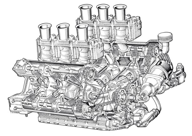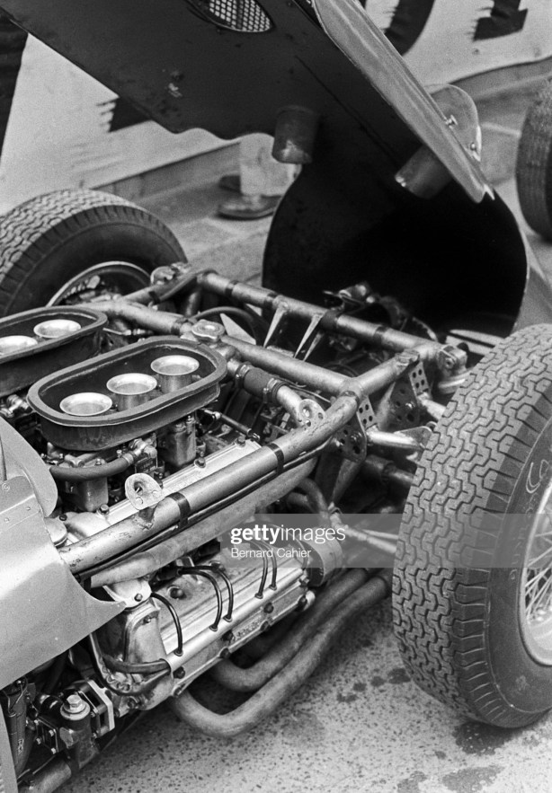 The 1.5-litre Vittorio Jano (and team) designed 65-degree V6 first appeared as a front-engined F2 car in 1958. The DOHC, chain-driven, two-valve, twin-plug, triple Weber fed motor developed circa 180bhp @ 9000rpm and was fitted to a scaled down version of the then current 2.5-litre Lancia D50 derived – and then further evolved – V8 engined 801 F1 chassis, then designated 156.