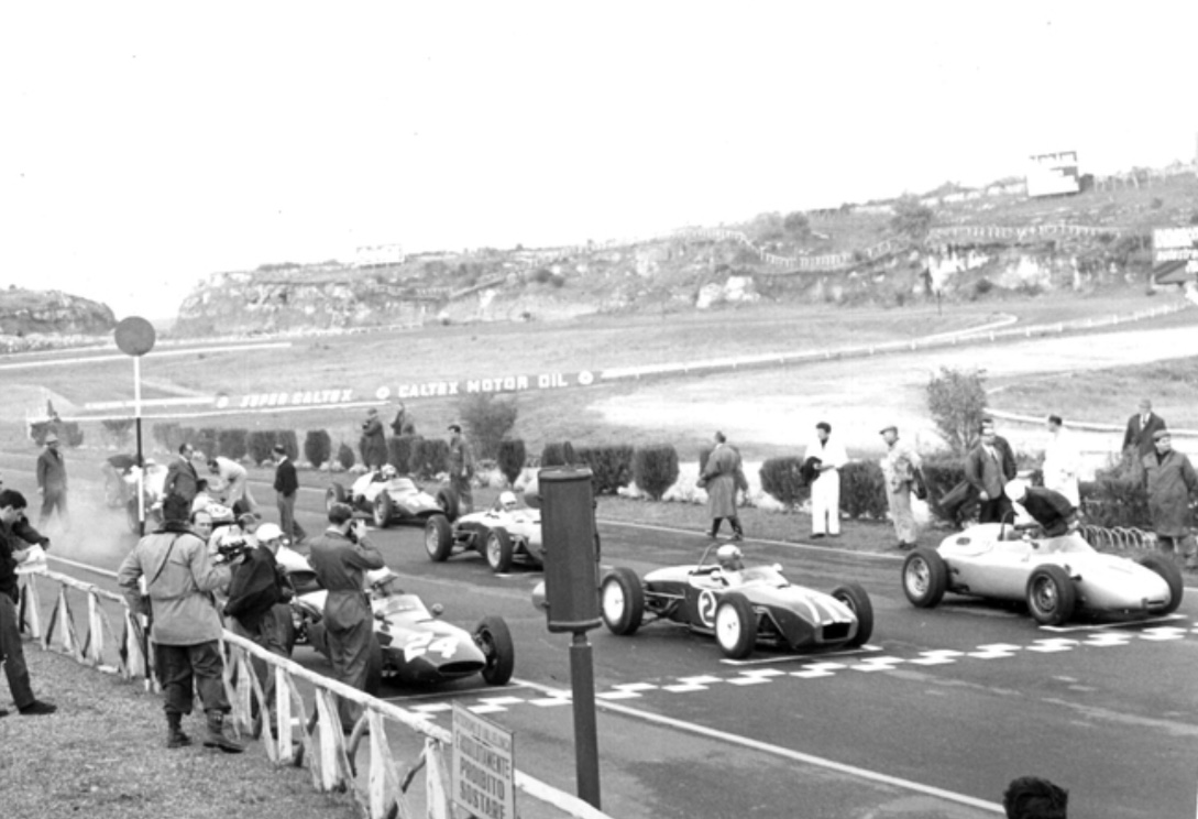 Aintree 1961 (Echo) Coppa Italia, Vallelunga October 12, 1961. #24 Nino Vaccarella rebodied Cooper Maserati T51, #2 Ernesto Prinoth, Lotus 18 Climax and at right Giancarlo Baghetti, Porsche 718. The Lotus 18 Maserati on row two is Gaetano Starrabba (unattributed)