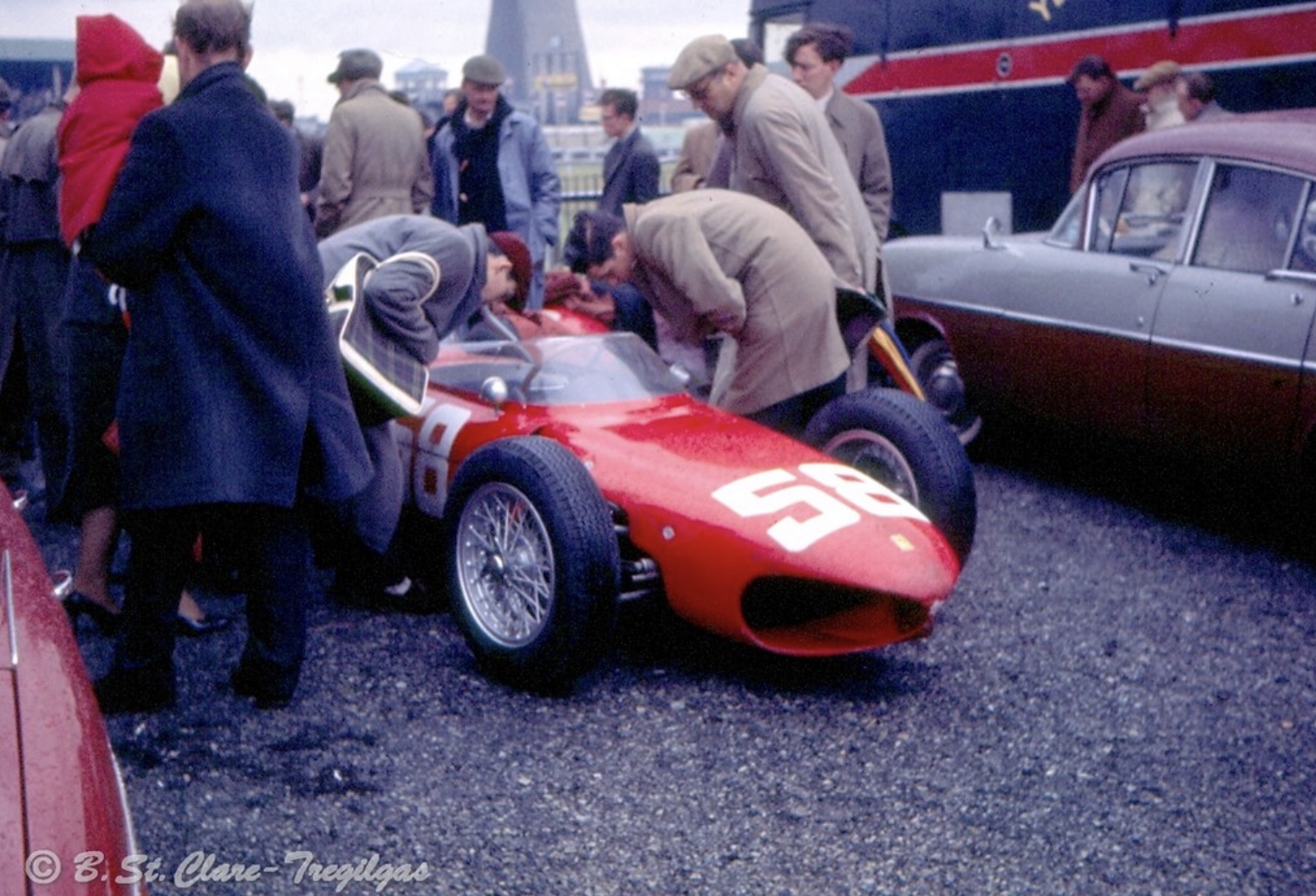 0008 in the Aintree paddock, note the different nosecone fitted to the car compared to that used in the Syracuse heat. Wire wheels were very much old hat by this stage, Ferrari retained them in 1962 but Campagnolo’s were part of the 156/63 package in 1963.