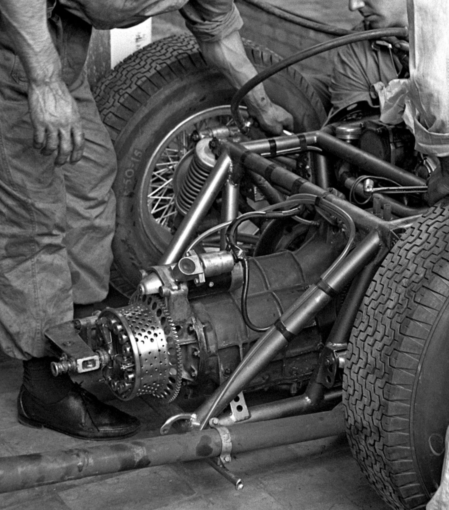 The shot below shows Hawthorn’s car (1958 #246/003) being attended to in the Silverstone paddock. Note the traditional twin-main tube Ferrari chassis, and subsidiary tubes, and powerful V6 engine canted to the right to allow the driveshaft to pass alongside the driver.