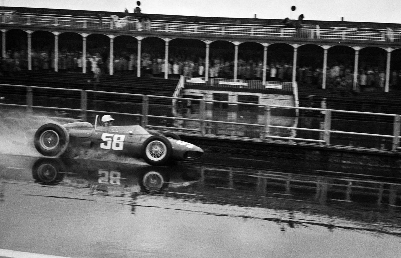 Evocative shot of Peter Collins in his Ferrari Dino 246, 1958 #246/002, during the July 1958 British Grand Prix at Silverstone.