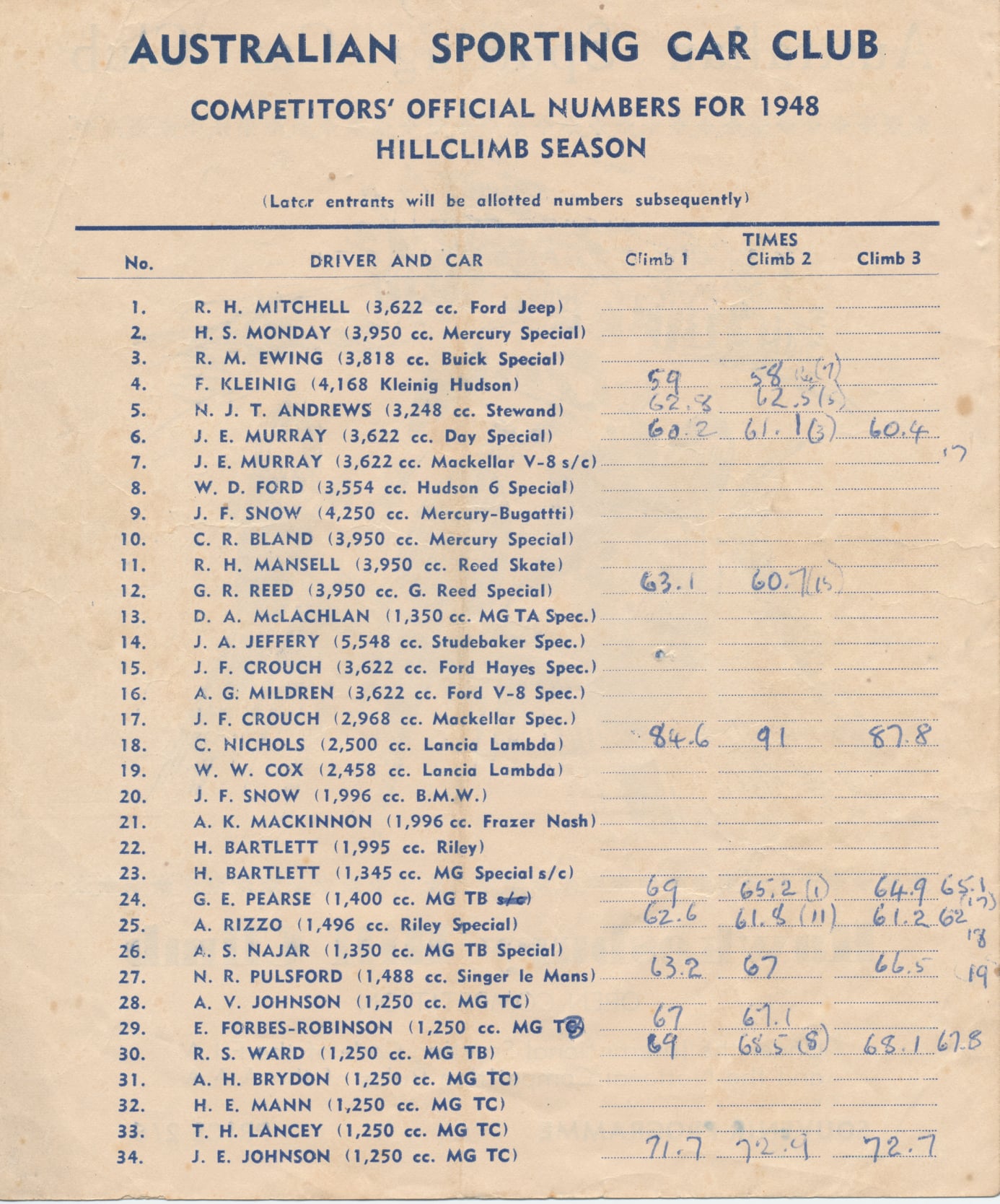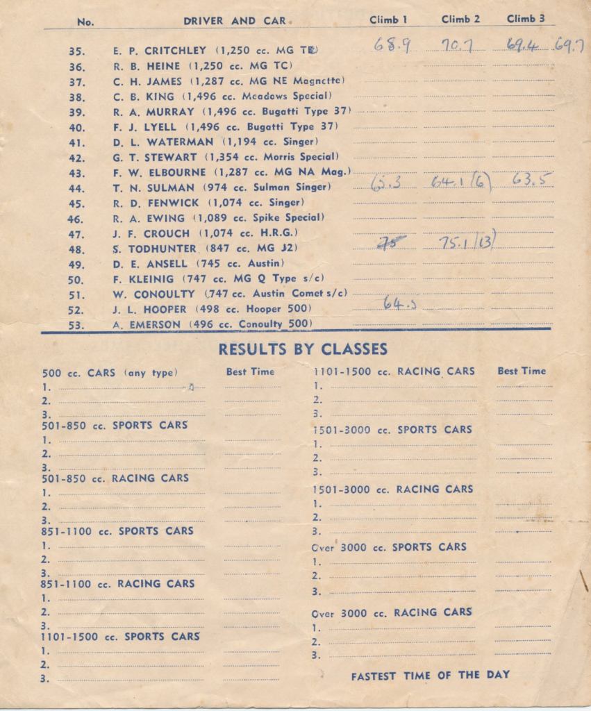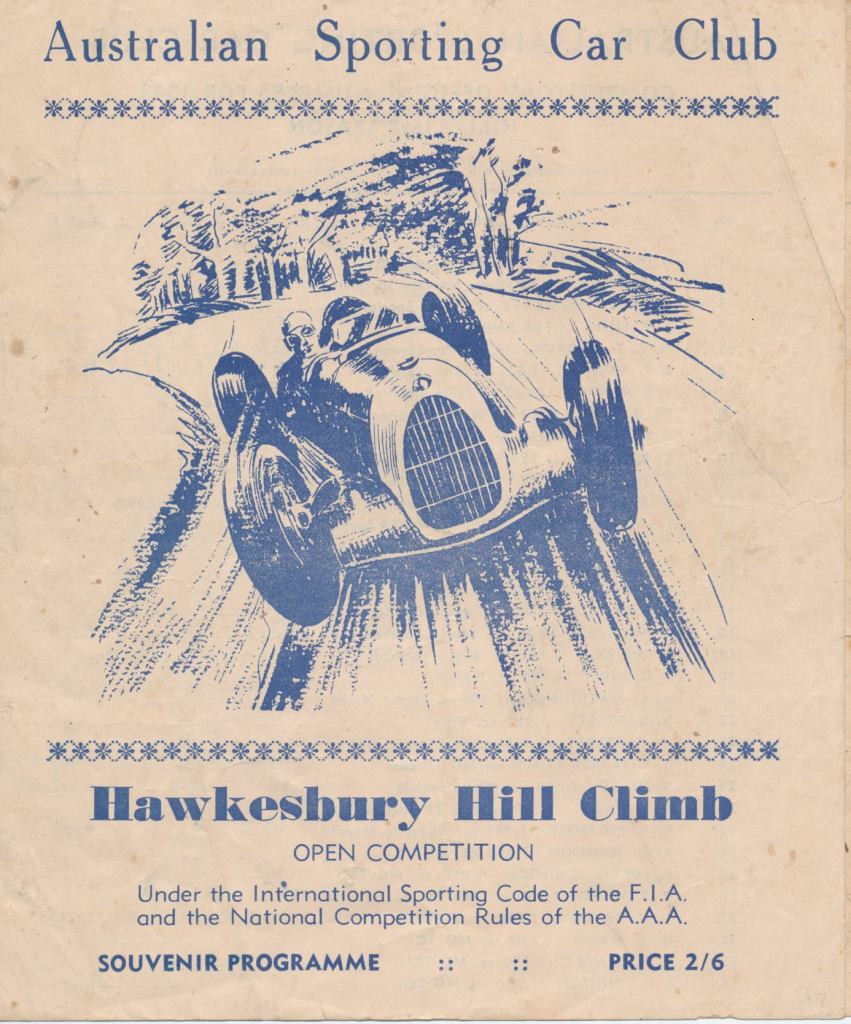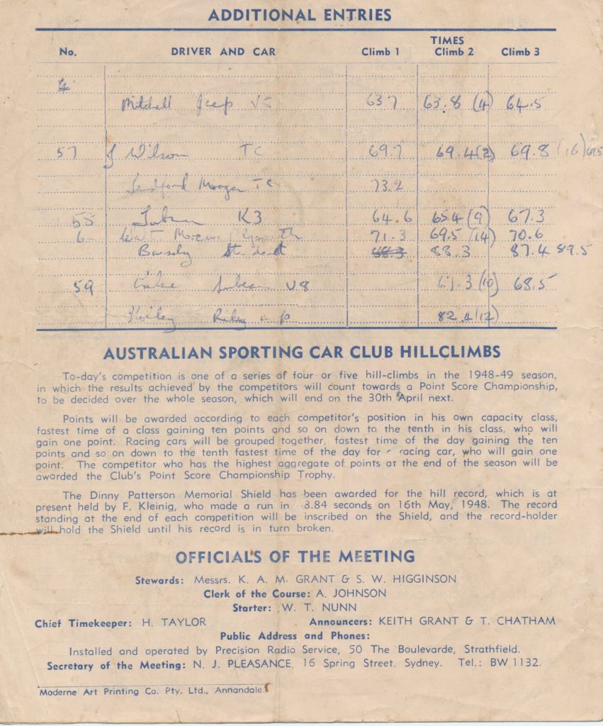 Since writing this, Cummins Archive (Paul Cummins) have posted on Facebook a 1948 programme for Hawkesbury hillclimb. It is not ‘our event’ as the numbers on recognizable cars differ – viz. Sulman Singer 32 in the photo and 44 in the published programme. This programme might help with the identification of some of the other cars – could Riley number 28 be the Rizzo Riley and the last car, which appears to be an Austin ‘7’ special be that of Ted Ansell? The list of competitors, which is a virtual Who’s Who of immediately post-war NSW racing drivers, appears to confirm Kent Patrick’s suggestion that the K3 MG is that of Tubman – see his listing under ‘Additional Entries’.