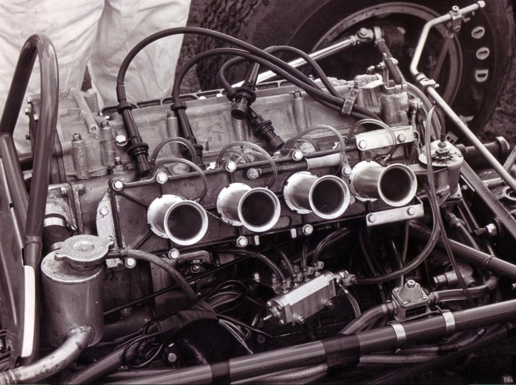 The two camshafts were still chain driven, the heads still two-valvers, and still twin-plug. The dimensions of the 1960 Solitude 65-degree engine were adopted – bore/stroke of 73mm x 58.8mm for a capacity of 1476.6cc. Nye reports that all of the major castings were made in Siluminum, the 120-degree engine weighed 225 pounds, 30 pounds less than the good ‘ole Coventry Climax 1.5-FPF four cylinder motor.