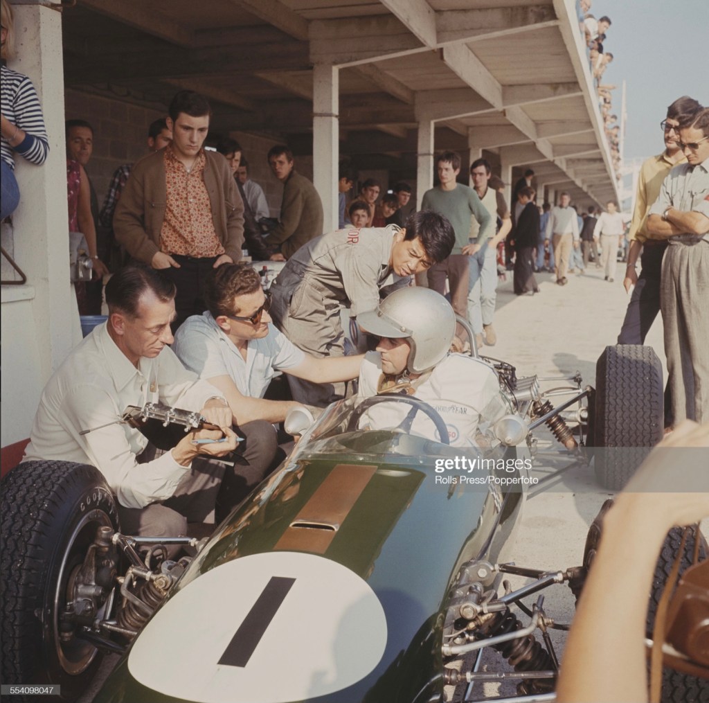 Jack Brabham, Brabham BT16 Honda during practice for the cancelled BARC Senior Service Trophy at Silverstone on March 20, 1965. The race was cancelled due to excessive amounts of water – visible – on the circuitRon Tauranac at left with stopwatch board, and Jack attend to changes during practice at Montlhery during the September 11, 1966 weekend. Brabham BT21 Honda. Brabham won by three seconds from Jim Clark’s Lotus 44 Ford SCA with Hulme two seconds behind Jim