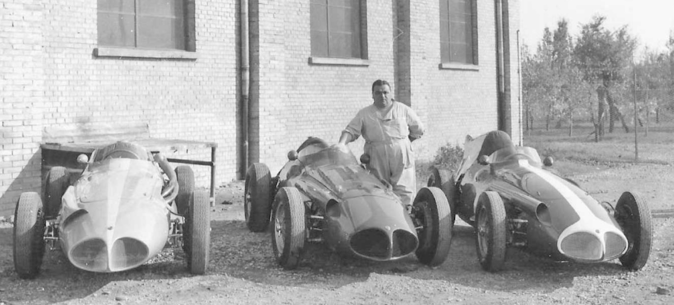 Medardo Fantuzzi with the three ‘shark nose’ Maserati 250Fs at his Modena factory in late 1957 or early 1958. Jensen’s at left – he finished second to Jack Brabham in the January 11, 1958 NZ GP in his upgraded car – the two Temple Buell machines alongside (unattributed)