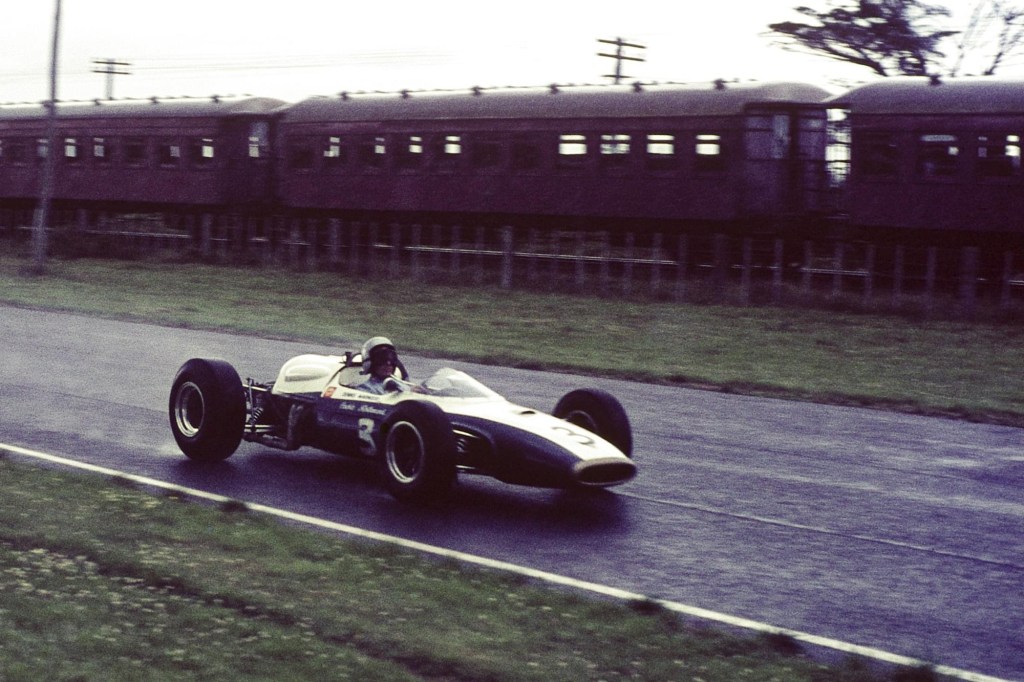 Dennis Marwood tries to focus on the job at hand while the 2.30pm Pukekohe-Auckland express rattles past: New Zealand Grand Prix, Pukekohe, January 8, 1966.