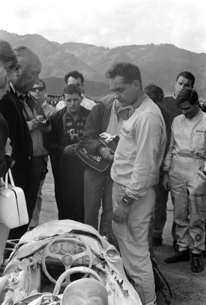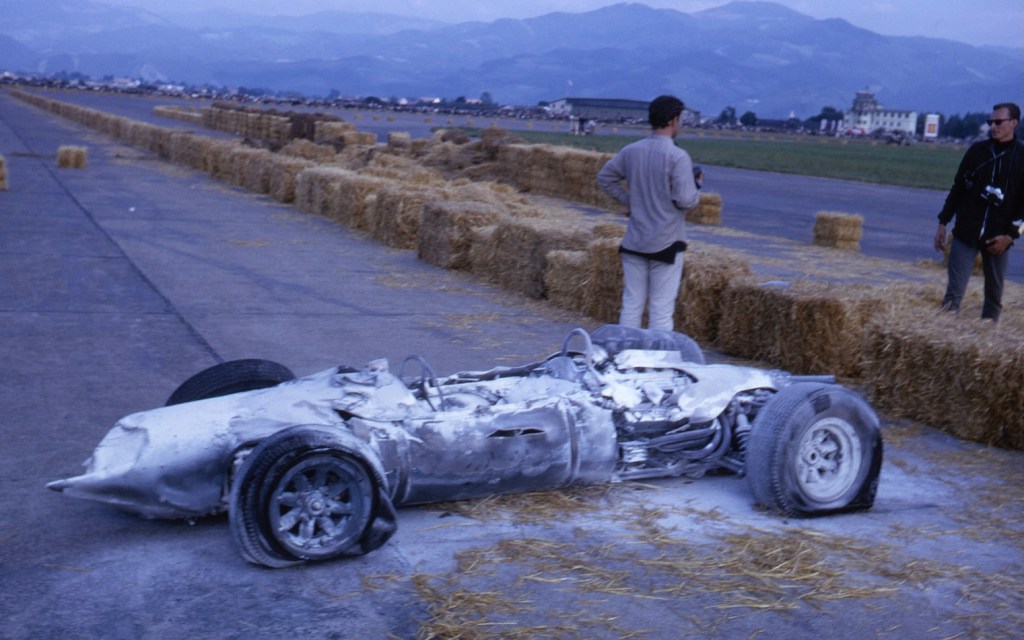 The car struck the wall of straw bales on the entry to the runway section of the track, rear suspension collapsed, and caught fire. Phil escaped quickly, unscathed while the car burned to a crisp in a spectacular, frightening display of pyrotechnics. Up front Lorenzo Bandini’s Ferrari 158 won a race of constantly changing fortunes.