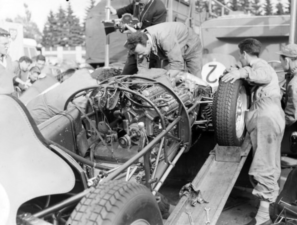 0008 always raced with the 65-degree 1.5-litre V6 rather than the definitive 1961 120-degree variant which Richie Ginther was to give debut at Syracuse, but didn’t at the last minute due to oil scavenge problems revealed in testing at Modena. Checkout this article on the testing of the 120-degree motor here; https://primotipo.com/2018/09/11/ferrari-156-testing/
