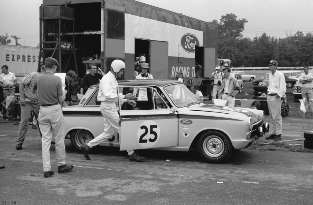 He is just about to climb aboard a Lotus Cortina in the Marlboro paddock, Maryland in August 1966. Parsons shared this car with Moffat – with helmet on behind the car – to 13th place in the 12-Hour enduro.