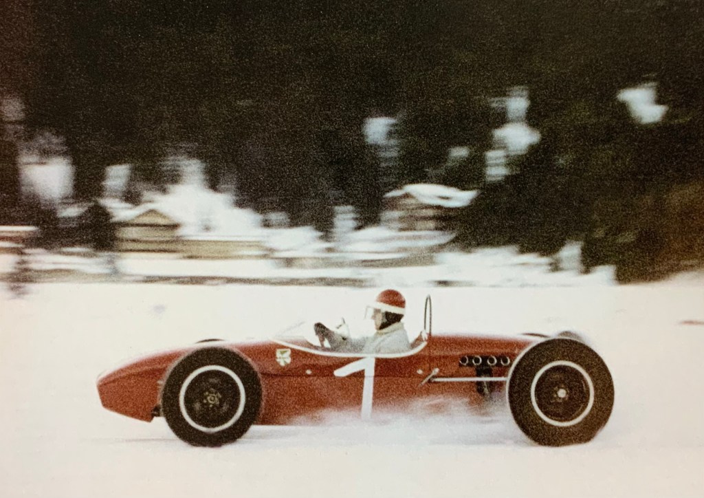 The shot above is of Peter racing a Lotus 18 Ford FJ in the National Iceslalom, at Arosa alongside the Obersee, Switzerland in December 1961; third, DNF transmission (go figure).
