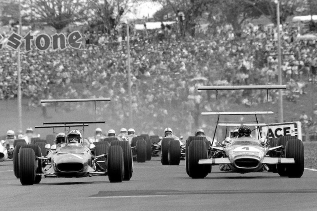 Chris Amon and Jochen Rindt, Ferrari 246T and Lotus 49 Ford, on the front row at Pukekohe, start of the New Zealand Grand Prix, first round of the 1969 Tasman Cup on January 4.