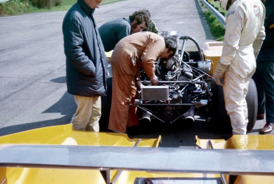 Alastair Caldwell comment; “Can-Am being warmed up, Denny, as normal, doing a visual check of the whole car, he would come up with some very acute observations at times. Ralph Bellamy behind (left), Designer of the M19 (1971 F1 car) rising rate suspension and later the F2 car (M21). Barry Sullivan leaning forward in front of Bellamy, Gordon Coppuck as well at right.” (A Bowler)Massive bit of real estate, superb M8F, Chev engine and Hewland LG600 Mk2 transaxle (A Bowler)