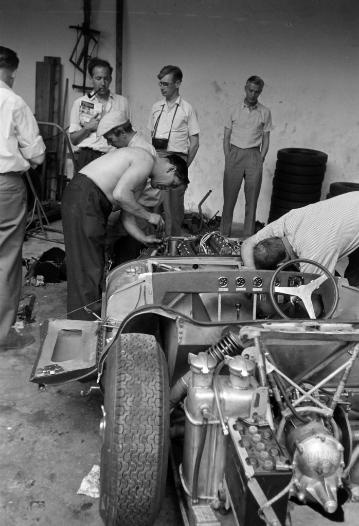 The Team Lotus crew prepare the Graham Hill/Derek Jolly Lotus 15 Coventry Climax 2-litre FPF at Le Mans during the 1959 24-Hour classic.