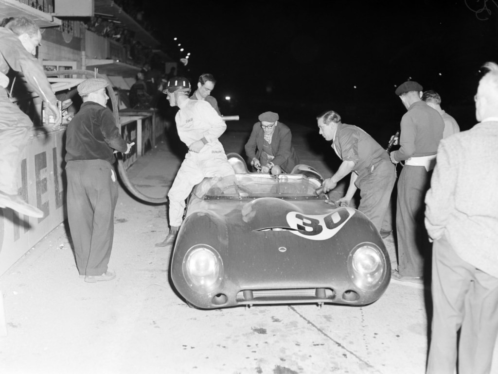 Stirling Moss is Aston Martin’s hare, he jumps away in the lead in his DBR1/300 from Innes Ireland’s Ecosse D-Type, then Ecosse #8 Tojeiro Jag, Ivor Bueb, #1 Lister LM Jag, car #6 is Maurice Trintignant’s Aston DBR1/300. The Roy Salvadori/Carroll Shelby Aston Martin DBR1 were victorious (MotorSport)Hill out, where is our Derek? (MotorSport)Derek Jolly at Le Mans in 1959 (ABC)