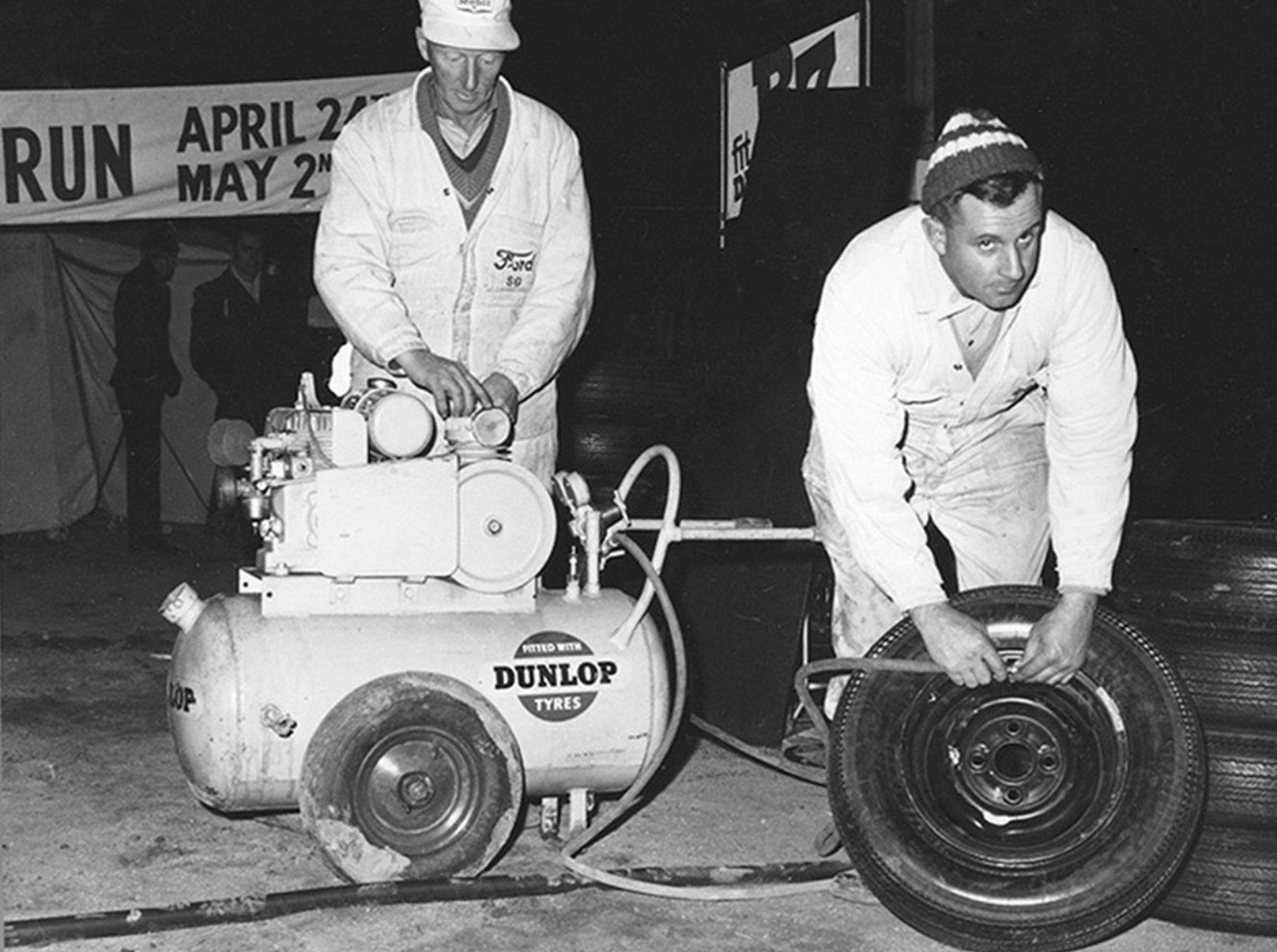 ‘The nature of the track layout and the ‘green’ top dressing shredded tyres to such an extent that drivers were signalled to ease up. When this was done tyre life was appreciably greater, although 70-plus mph lapping was still being put in. The Dunlops were worked hard all the time, and on occasions grossly overworked. But throughout all the tyre incidents, not once did a cover part company with the rim, even when one driver returned at 60 mph to the pits with its deflated cover on fire. On the third day of the run, at the drivers’ request, tubes were fitted to the SP41s. As the twisting 21-mile circuit became bedded-in, the tyre wear factor improved and a set lasted roughly six hours. By the second last night only one of the five cars needed a tyre change. And this was to the front offside which had suffered punishment for hours.’