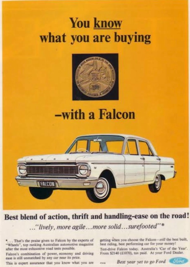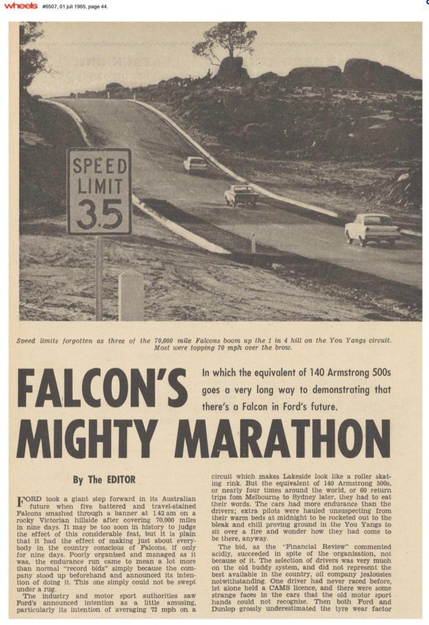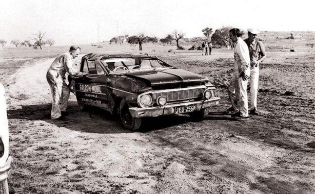 ‘Ford took a giant step forward in its Australian future when five battered and travel-stained Falcons smashed through a banner at 1.42 am on a rocky Victorian hillside after covering 70,000 miles in nine days. It may be too soon in history to judge the effect of this considerable feat, but it is plain that it had the effect of making just about everybody in the country conscious of Falcons, if only for nine days. Poorly organised and managed as it was, the endurance run came to mean a lot more than normal “record bids” simply because the company stood up beforehand and announced its intention of doing it. This one simply could not be swept under a rug.’