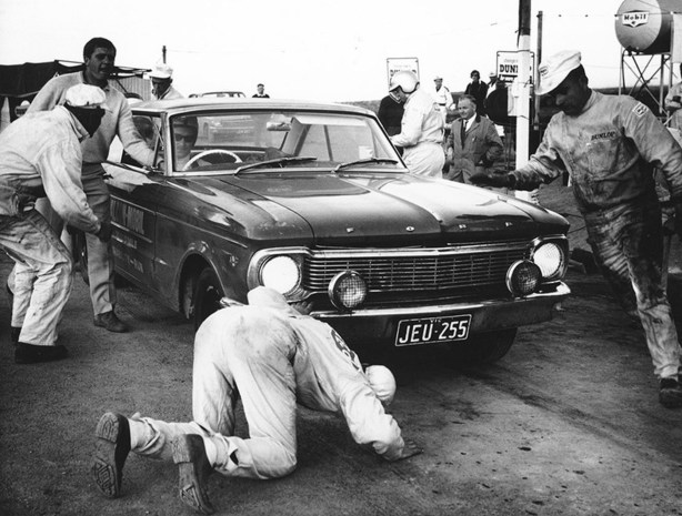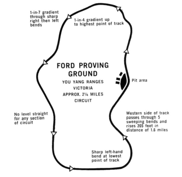 ‘The industry and motor sport authorities saw Ford’s announced intention as a little amusing, particularly its intention of averaging 72 mph on a circuit which makes Lakeside look like a roller skating rink. But the equivalent of 140 Armstrong 500s, or nearly four times around the world, or 60 return trips from Melbourne to Sydney later, they had to eat their words. The cars had more endurance than the drivers; extra pilots were hauled unsuspecting from their warm beds at midnight to be rocketed out to the bleak and chill proving ground in the You Yangs to sit over a fire and wonder how they had come to be there, anyway.’