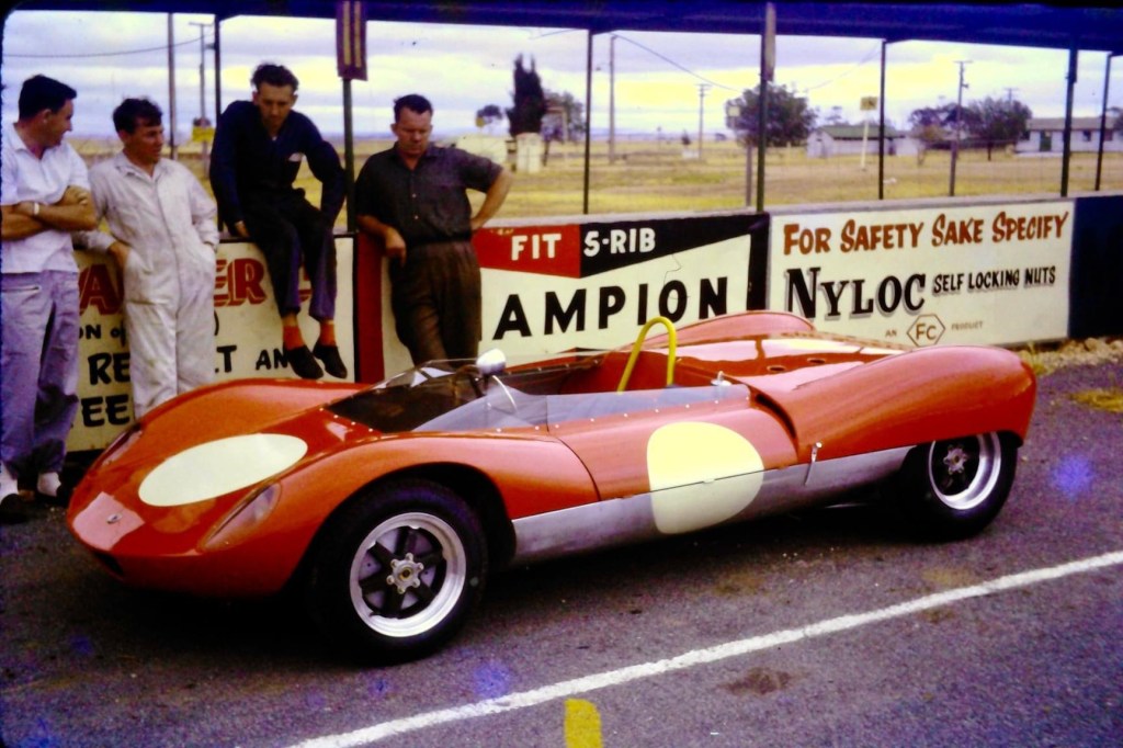 These two fabulous shots were taken at Mallala circa 1964. It is the delivery session of Greg’s brand new Elfin Mallala Ford twin-cam by Garrie Cooper (in the natty red sox) and the Elfin boys into the care of the Cusacks. That Rice Trailer will shortly be off on the trip home to Canberra.