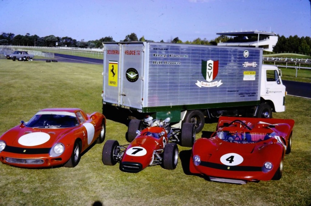 The line up is the Ferrari 250LM bought new by McKay first raced for him by Spencer Martin during some of the 1965 Australian Tasman Cup rounds, the ex-Jack Brabham ’67 Tasman mount – Brabham BT23A Repco, and ex-works Ferrari 350 Can Am machine raced throughout 1967 as a P4 enduro coupe before being converted – along with another of its siblings – for Can-Am use in the latter months of 1967 driven by Chris Amon and Jonathon Williams.
