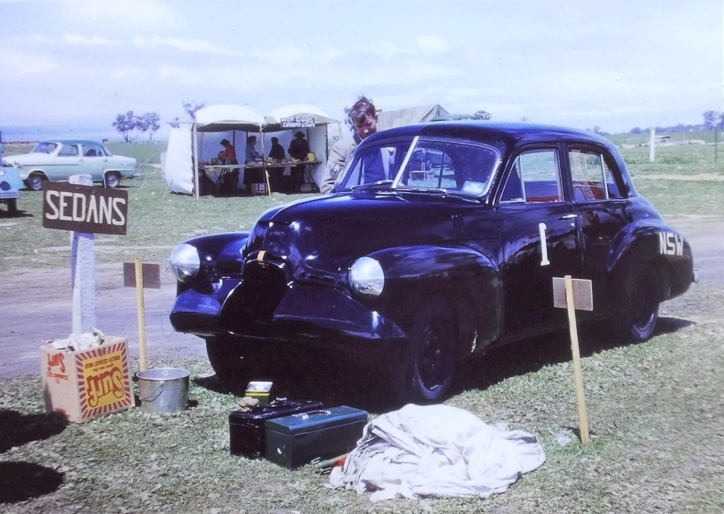 Bob was obviously a Leo Geoghegan fan, the earliest of his shots is of Leo doing a lap of honour in an official’s Austin Healey at Mount Druitt, Sydney, perhaps on the day be beat Frank Gardner’s Jaguar C-Type in a handicap race aboard his very quick Holden 48-215, the car is shown below in the Mount Panorama paddock in 1958.