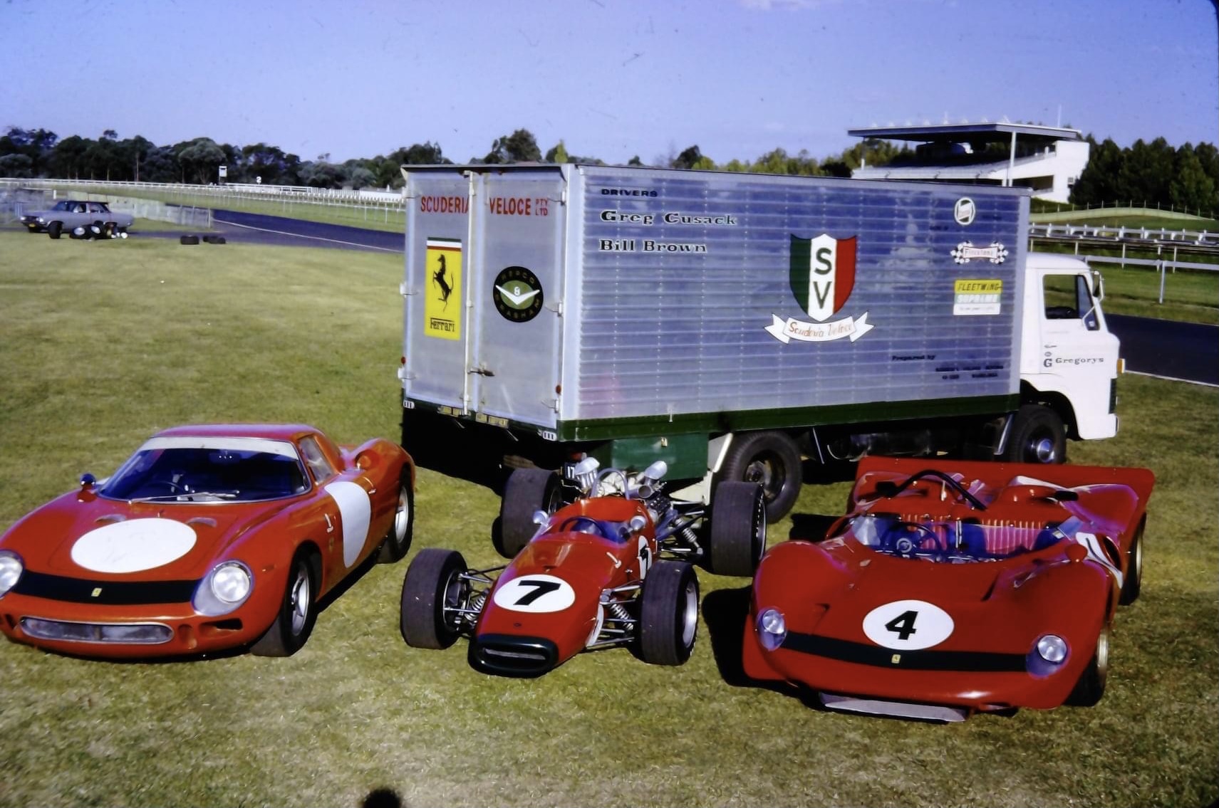 The line up is the Ferrari 250LM bought new by McKay first raced for him by Spencer Martin during some of the 1965 Australian Tasman Cup rounds, the ex-Jack Brabham ’67 Tasman mount – Brabham BT23A Repco, and ex-works Ferrari 350 Can Am machine raced throughout 1967 as a P4 enduro coupe before being converted – along with another of its siblings – for Can-Am use in the latter months of 1967 driven by Chris Amon and Jonathon Williams.