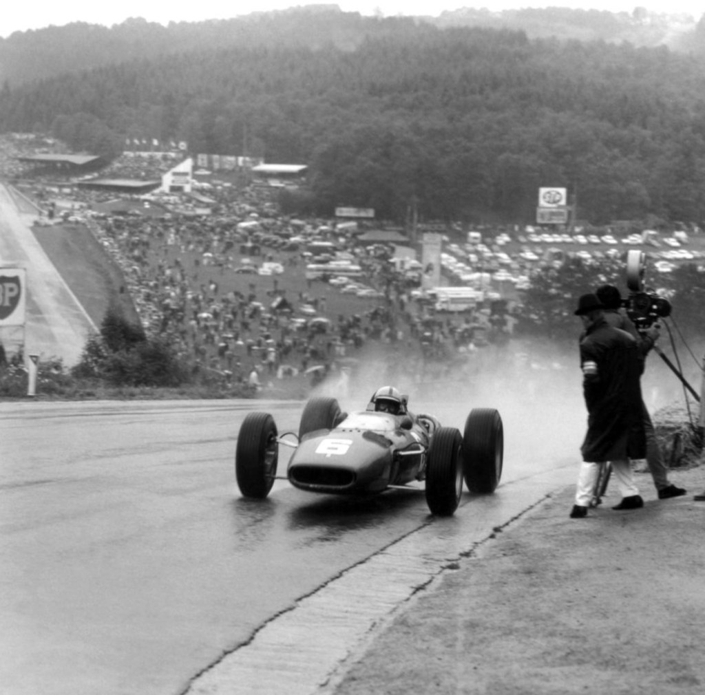 Look out blokes, ‘comin through! John Surtees at Eau Rouge, Spa, Ferrari 312 in 1966, ‘Grand Prix’ cinematographers totally unperturbed by the Flying Ferrari. Surtees won from Jochen Rindt’s Cooper T81 Maserati and Lorenzo Bandini’s Ferrari 158/246 (MotorSport)
