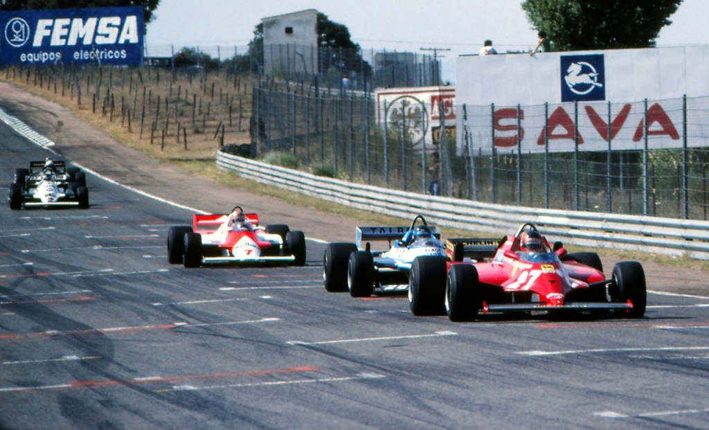 High speed Jarama caravan in 1981. Brilliant drive of controlled precision and aggression by Gilles Villeneuve won the race for Ferrari. His more powerful and more unwieldy 126CK just held his pursuers at bay; Jacques Laffite, Ligier JS17 Matra, John Watson, McLaren MP4/1 Ford, Carlos Reutemann’s, Williams FW07C Ford and the just visible Elio de Angelis, Lotus 87 Ford – they finished in this order (unattributed)