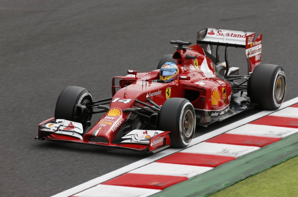 Fernando Alonso, Ferrari F14T at Suzuka in October 2014. DNF in the race won by Lewis Hamilton’s Mercedes Benz F1W05 Hybrid. What visual atrocities the cars of 2014 were (MotorSport)