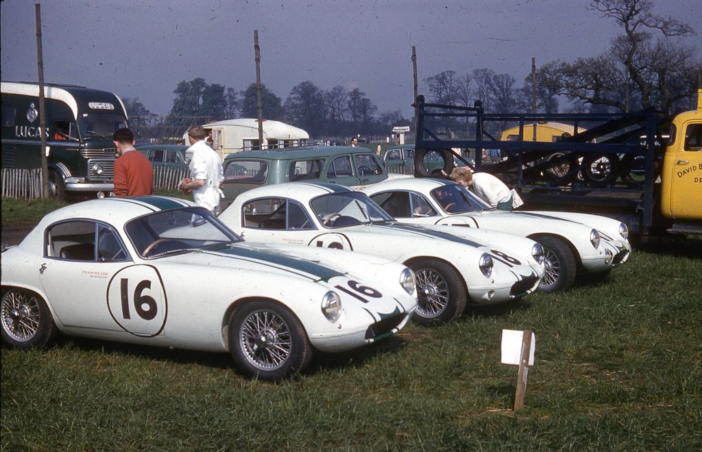 On 15 or 16 April 1961, before they started racing, the team visited Oulton Park in Cheshire for the GT Cars Trophy Race. Here above are the Lotus Elites of John Wagstaff #16, Bill Allen and Peter Arundell; there are some seven Elites in the race.
