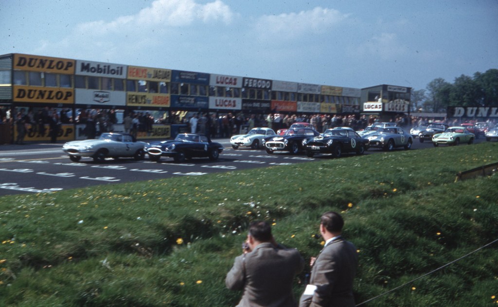 Roy Salvadori #5 above leads Graham Hill #4 off the grid, both driving E-Types. Just behind are John Wagstaff #16 (Lotus Elite Climax), Jack Sears #3 (Ferrari 250 GT Berlinetta) and Innes Ireland #8 (Aston Martin DB4).