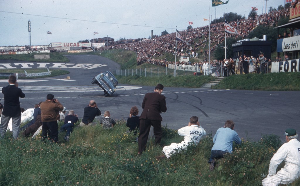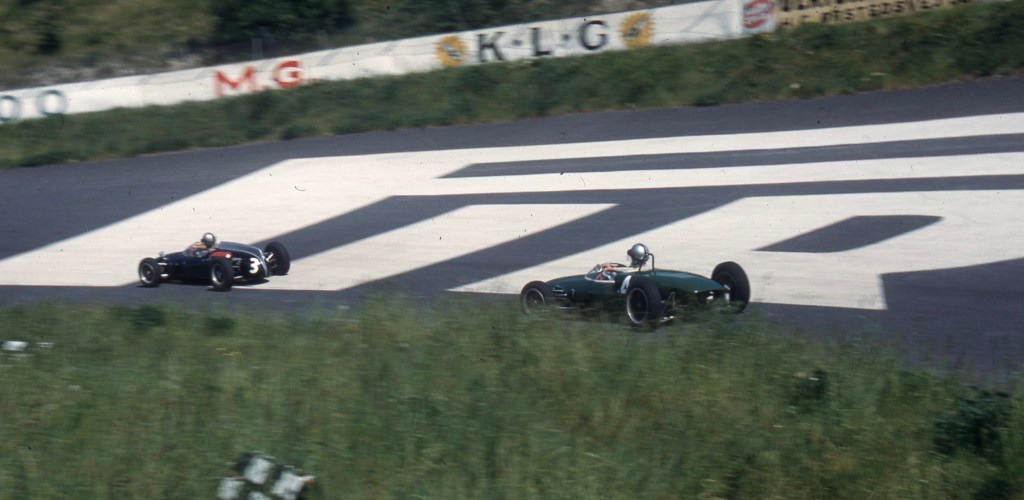 Denny’s Cooper T56-BMC (later Ford) in blue/silver, is seen here at Roskilde during practice for the Copenhagen Cup in May, he is ahead of Angus who later won the race, Denny placed seventh.