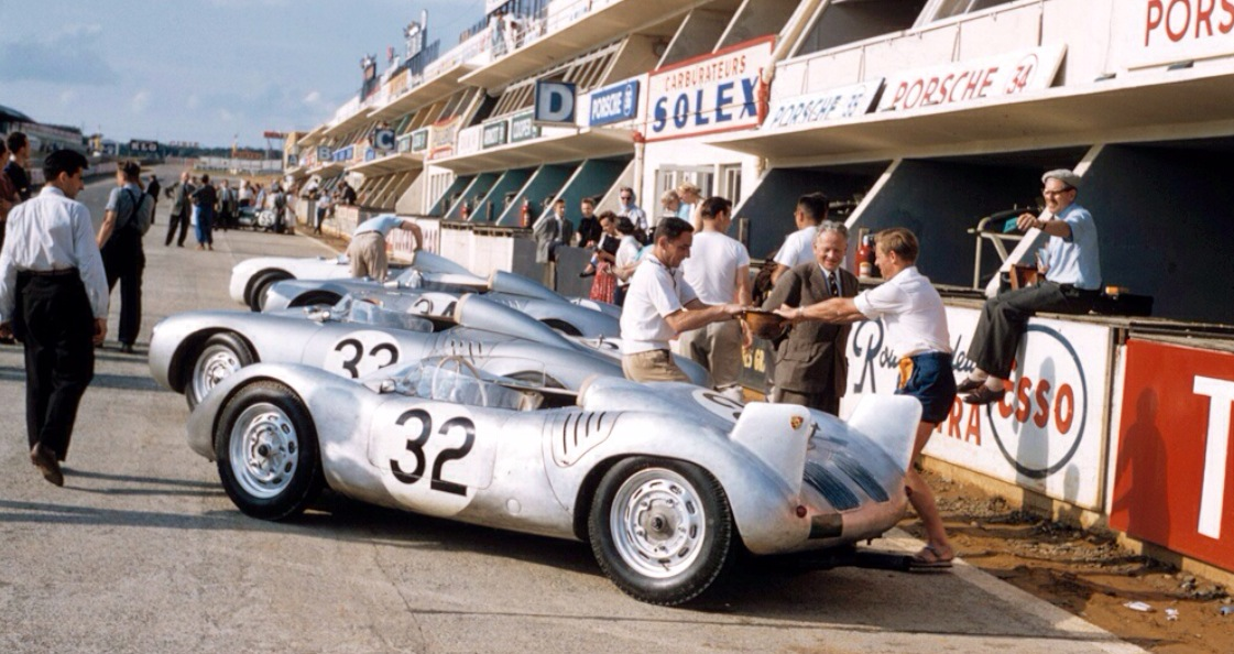 Ferry Porsche is in the suit and racing manager Huschke von Hanstein is on the pit counter.