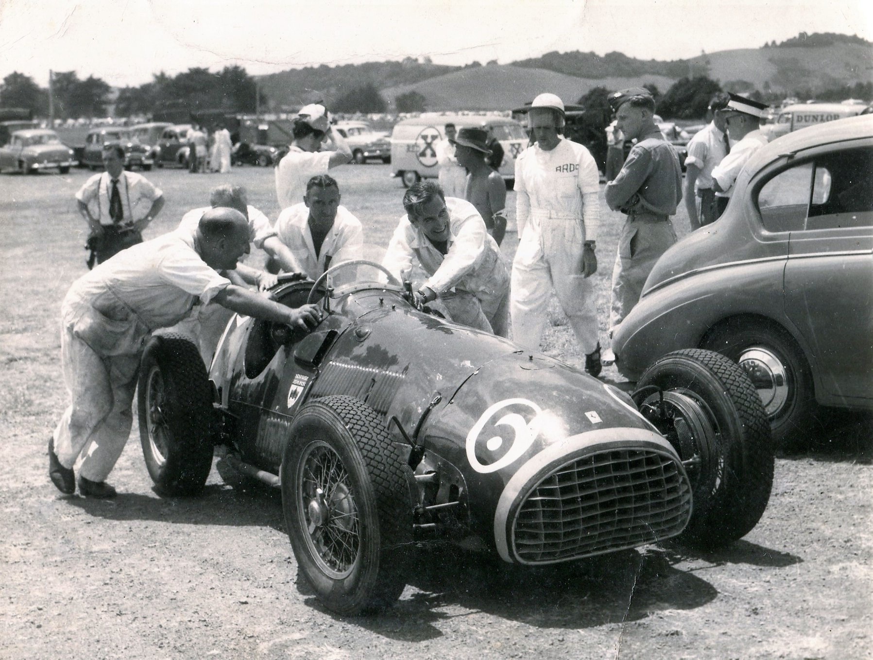 Dick Cobden’s Ferrari 125 being pushed through the Gnoo Blas paddock during the January 1955 South Pacific Trophy weekend. The youthful driver behind with the Persil whiter-than-white overalls is JA Brabham in search of his Cooper T23 Bristol.