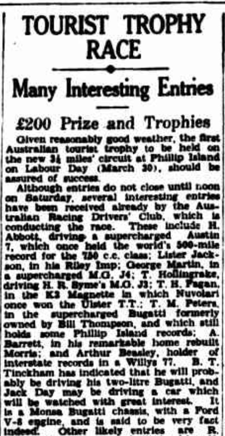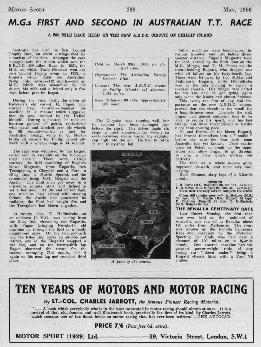 (F Pearse) The caption reads ‘A diagram showing the new 3 1/2 mile circuit at Phillip Island which will be used for the 200 miles Australian Tourist Trophy on March 30’- the map also shows the original circuit since the 1928 100 Miles road race, aka the Australian Grand Prix. Fagan MG K3 (F Pearse)
