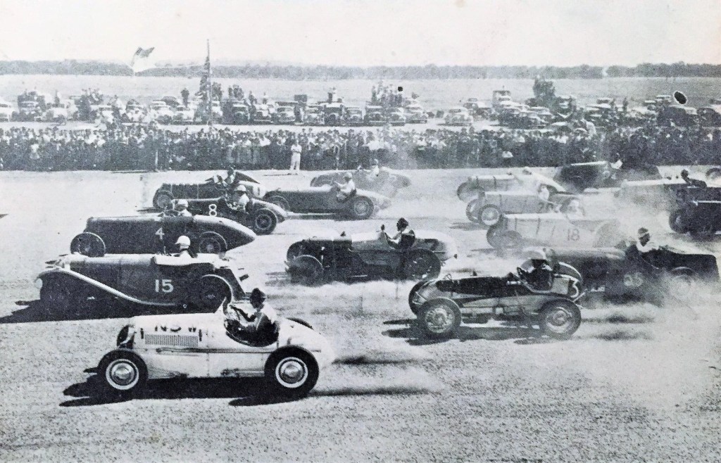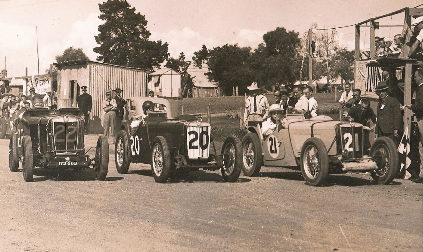 The first two cars are MG TCs, Col Robinson’s #32, and J Hillhouse in #30. #17 is the more focused TC Spl of Dick Cobden, then Peter Critchley’s fourth placed ex-Alf Najar MG TB Spl, and on the far side, Arthur Rizzo’s Riley Spl, who finished third on the RAAF airfield track