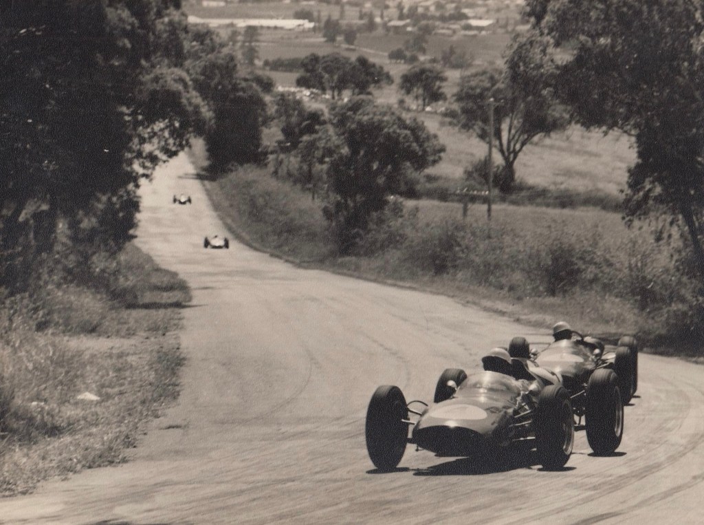 Lex Davison, Cooper T62 Climax FPF 2.7 ahead of David McKay, Brabham BT4 Climax FPF 2.7 during the April 1963 Easter Bathurst Gold Star round.