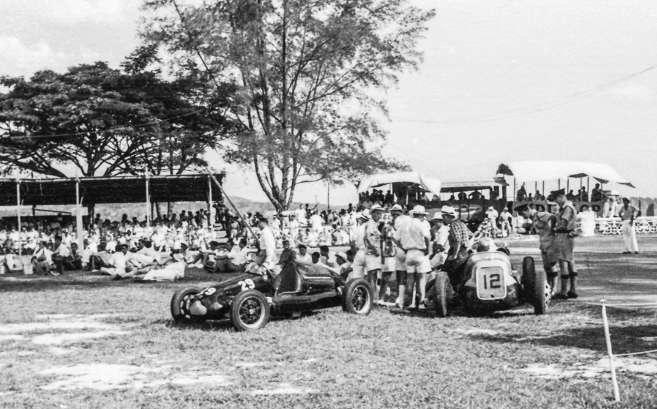 Perth’s Syd Anderson, Double Ford V8, and LC Chan’s Cooper 1100 at the start of the August 2, 1953 Johore Grand Prix in Malaya.