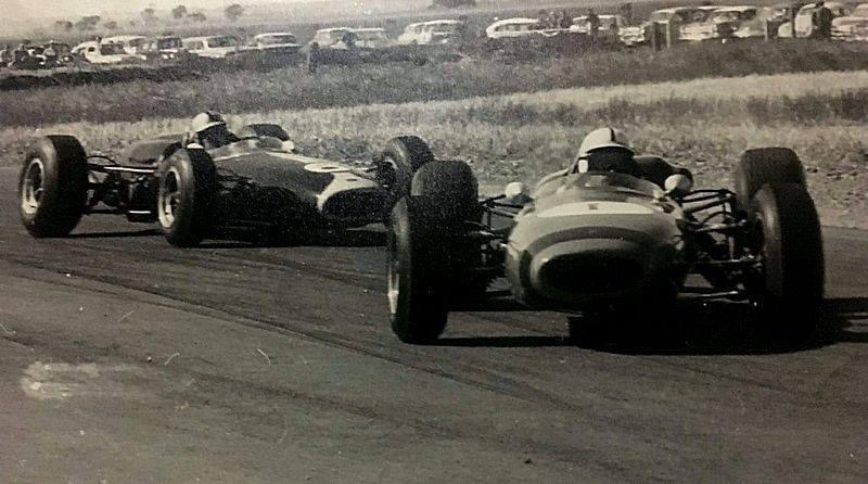 Spencer Martin from Bib Stillwell both aboard Brabham BT11A Climaxes during the Mallala Gold Star round in October 1965.