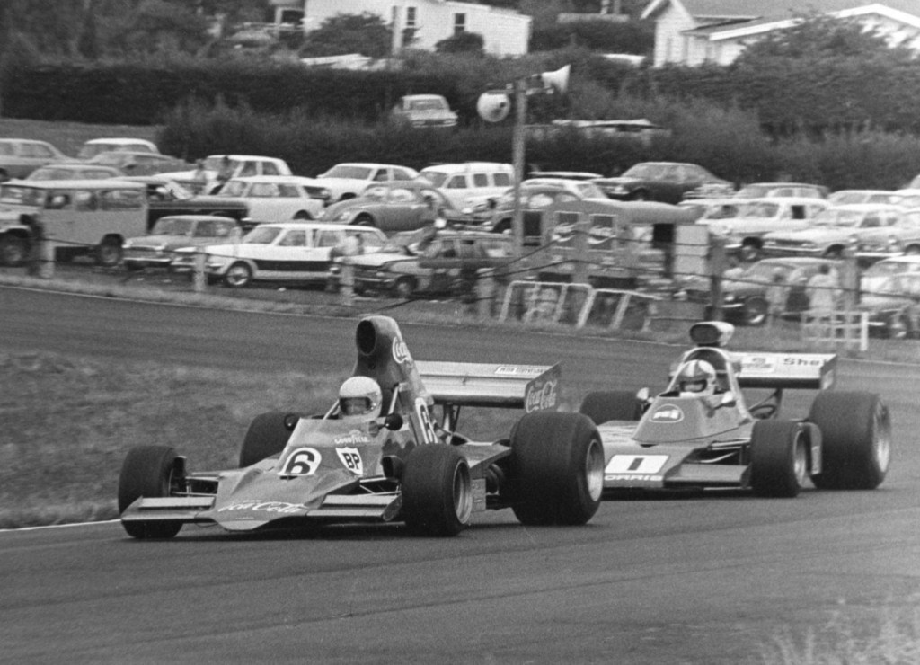 Max Stewart’s Lola T400 Chev ahead of Chris Amon’s Talon MR1 Chev at Pukekohe during the 1975 NZ GP.