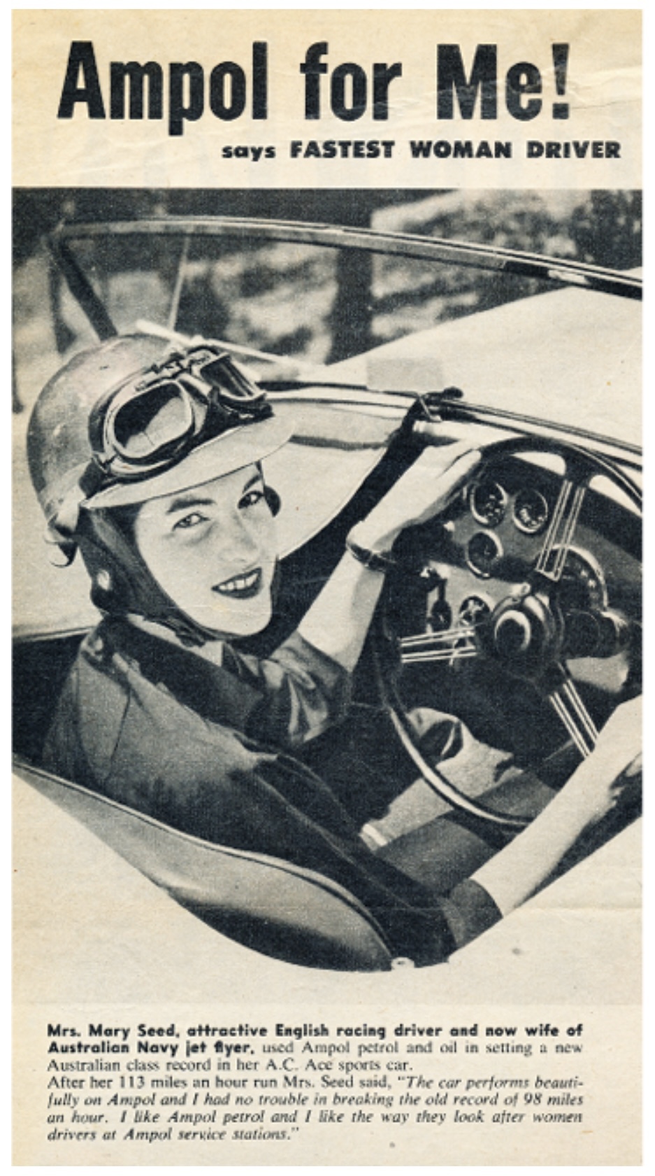 Seed had raced an Austin Healey in the UK in 1955 and raced the AC in Australia from 1956 to 1959, including setting an Australian Land Speed Record for women at 113.3mph at Carrathool in 1957.