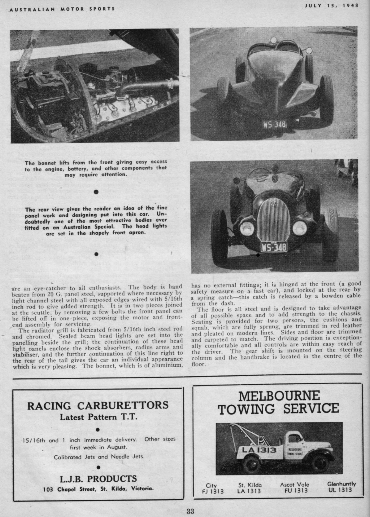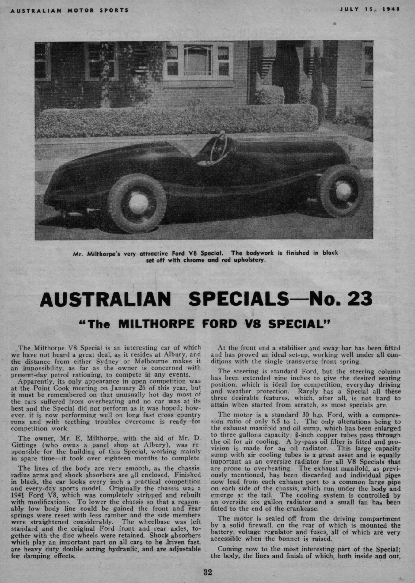Built by Albury man, Charlie Milthorpe in 1947-48, the car was based on an ex-army 1941 Ford ute chassis and fitted with an amalgam of FoMoCo bits; ’39 gearbox, ’40 front axle, ’35 rear end and a ’51 side-valve V8 fitted with a Stromberg 97 carb, brakes were Customline.