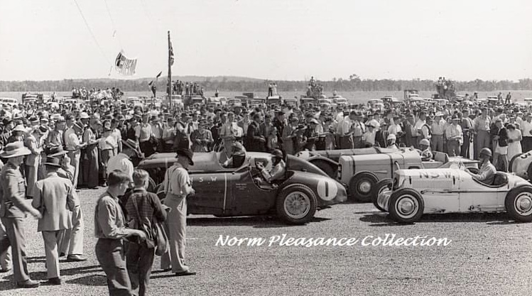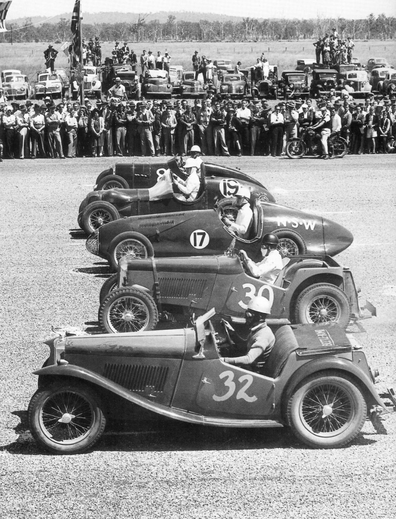 One row of the 28 starters of the 35 lap, 150 mile, 1949 Australian Grand Prix – or more likely the supporting F2 race – at Leyburn, Queensland, await the drop of the flag on September 18.