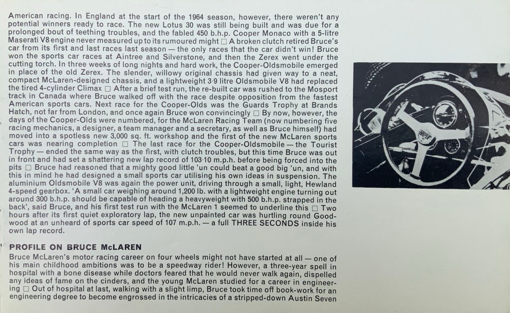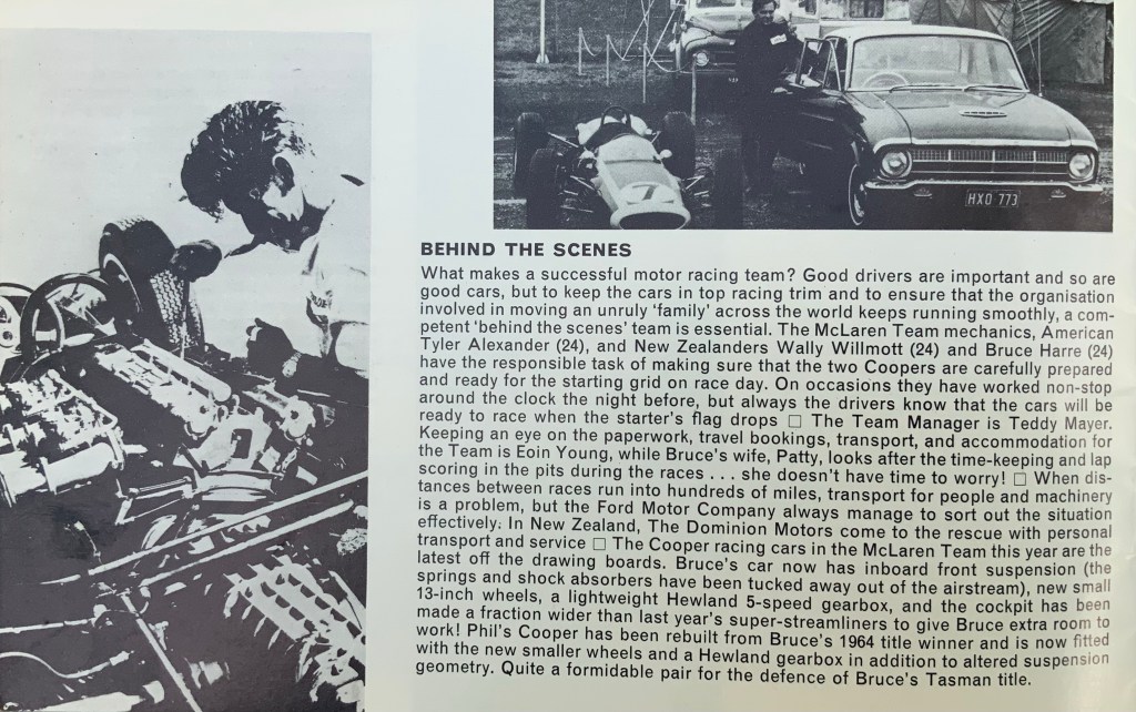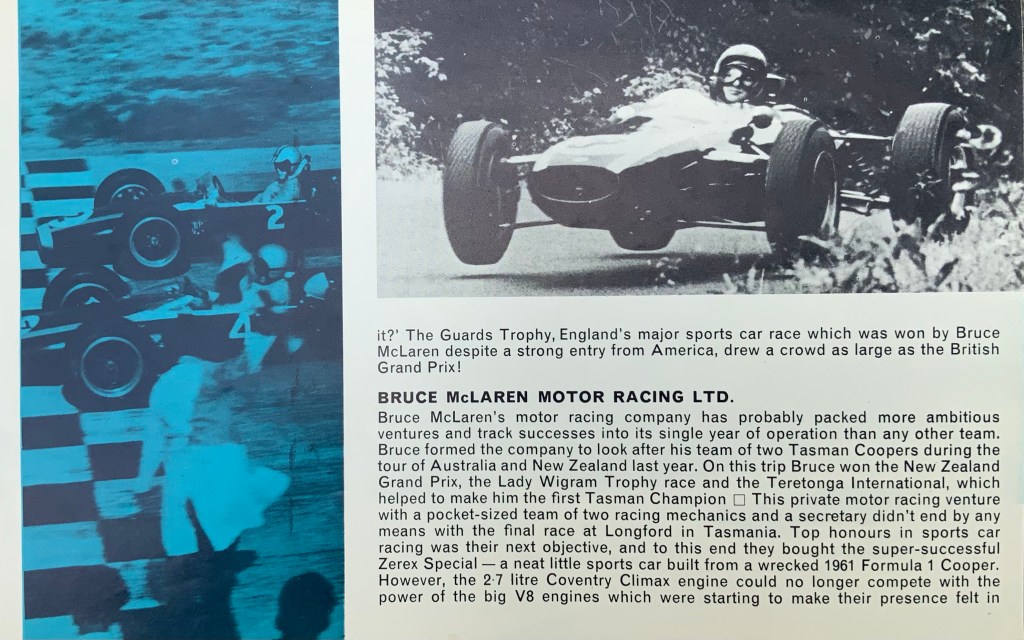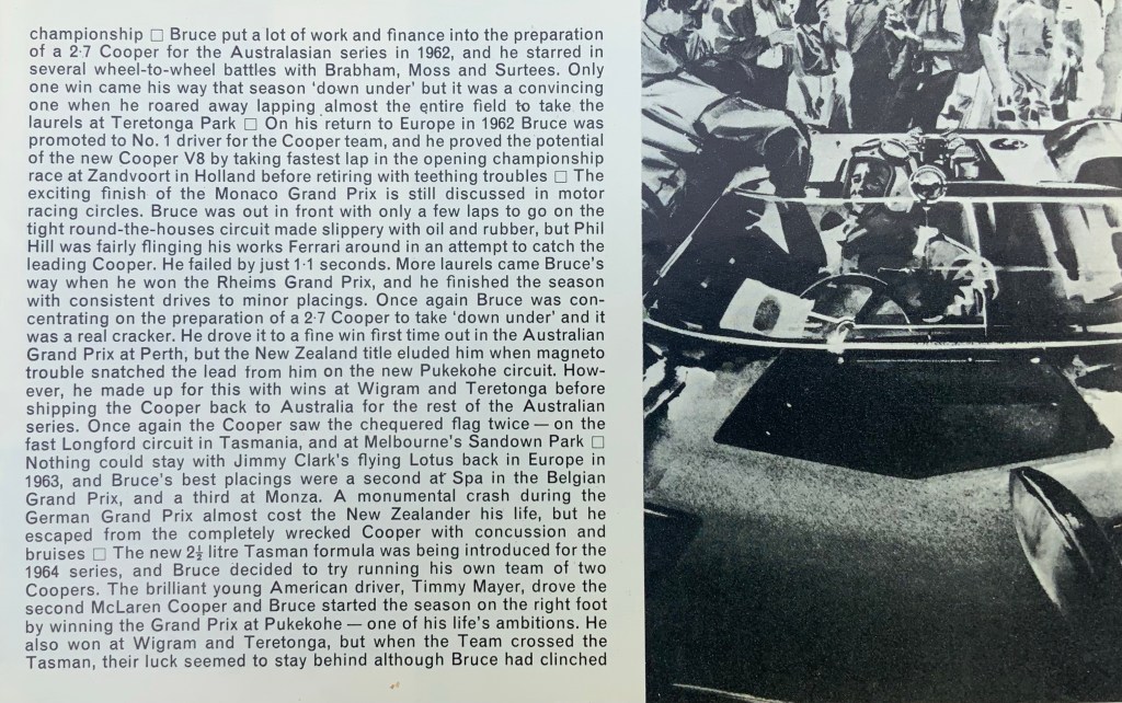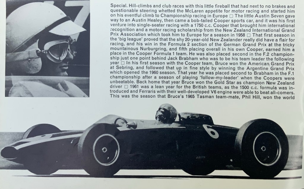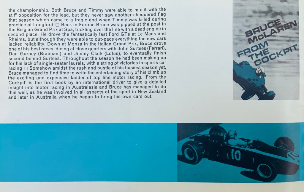 The nascent Bruce McLaren Motor Racing Team cars were raced by the boss and young, very talented American thruster, Tim Mayer. That years Tasman was a triumph for McLaren, he won three of the seven rounds, but it was also disastrous as Mayer lost his life in the final round at Longford.