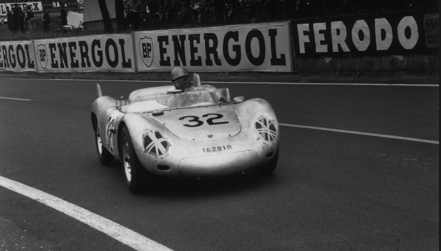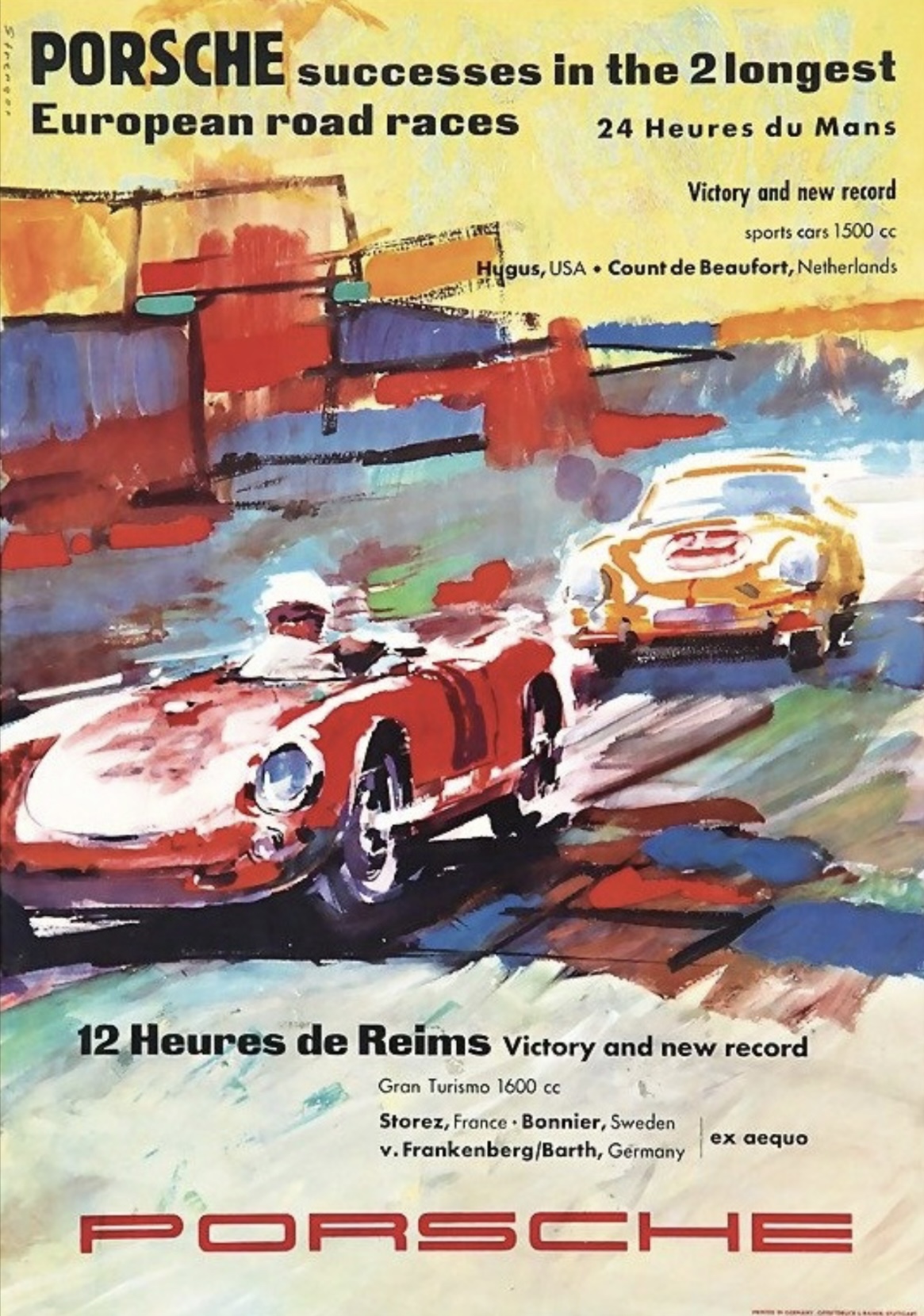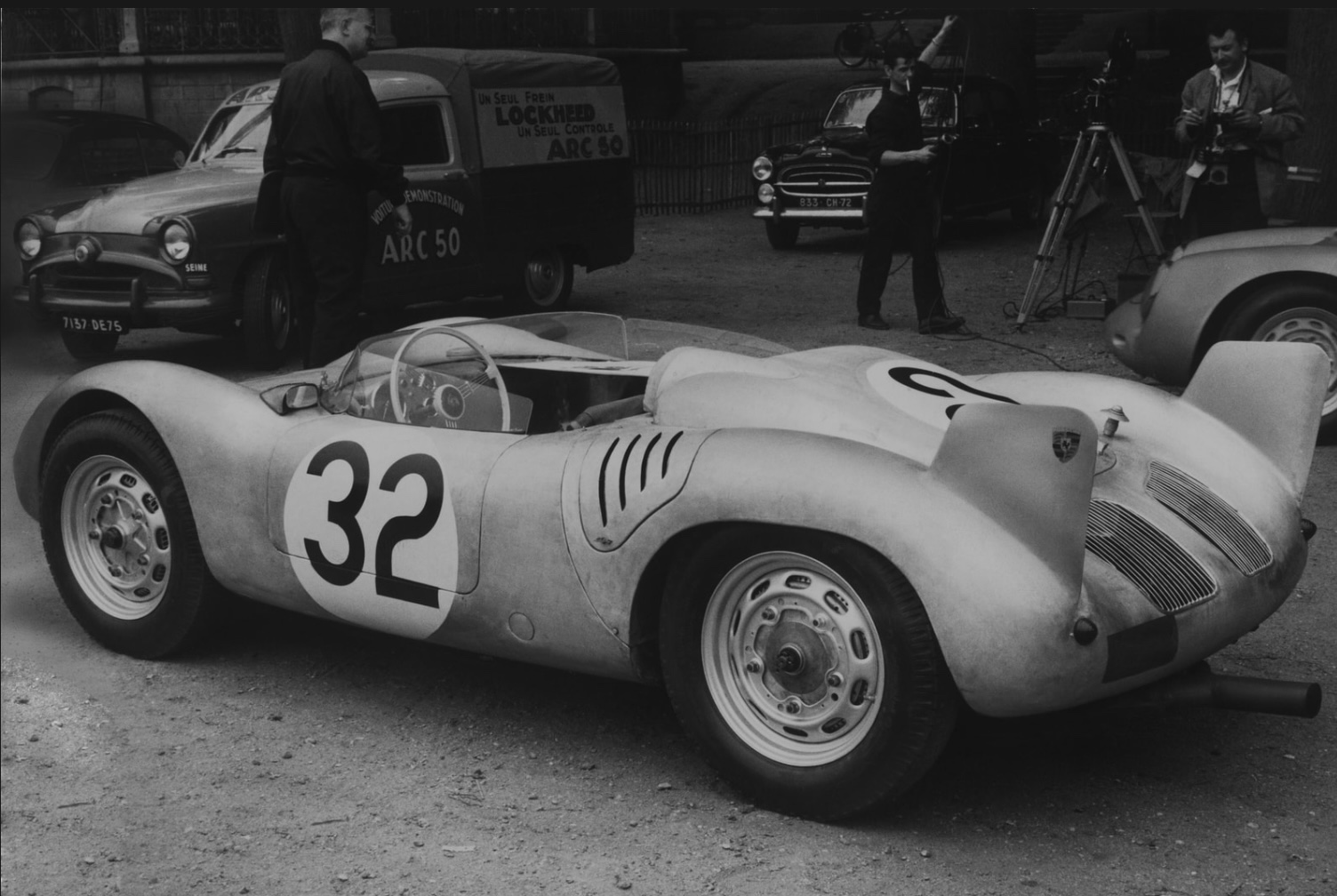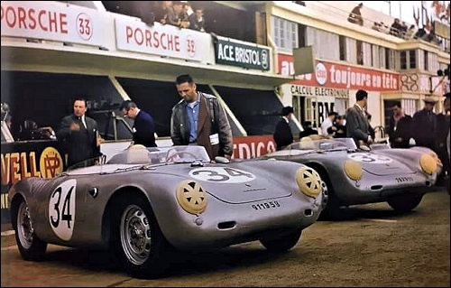 The cars are the #32 718RSK of Umberto Maglioli/Edgar Barth, the #33 550A of Hans Hermann/Richard von Frankenberg and #34, the 550A of Claude Storez/Ed Crawford; DNF, DNF and non-classified respectively. The best placed Porsche that year was the privately entered 550A of Ed Hugus and Carel de Beaufort in eighth place.