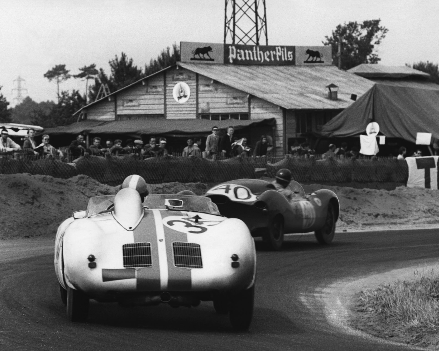 The eighth-placed Ed Hugus/Carel Godin de Beaufort Porsche 550A chases the Jack Brabham/Ian Raby Cooper T39 Climax, 15th, during Le Mans in 1957.