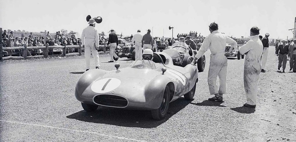 On the grid of the 27-lap, 100-mile, January 1956, South Pacific Championship at Gnoo Blas, Orange, New South Wales.